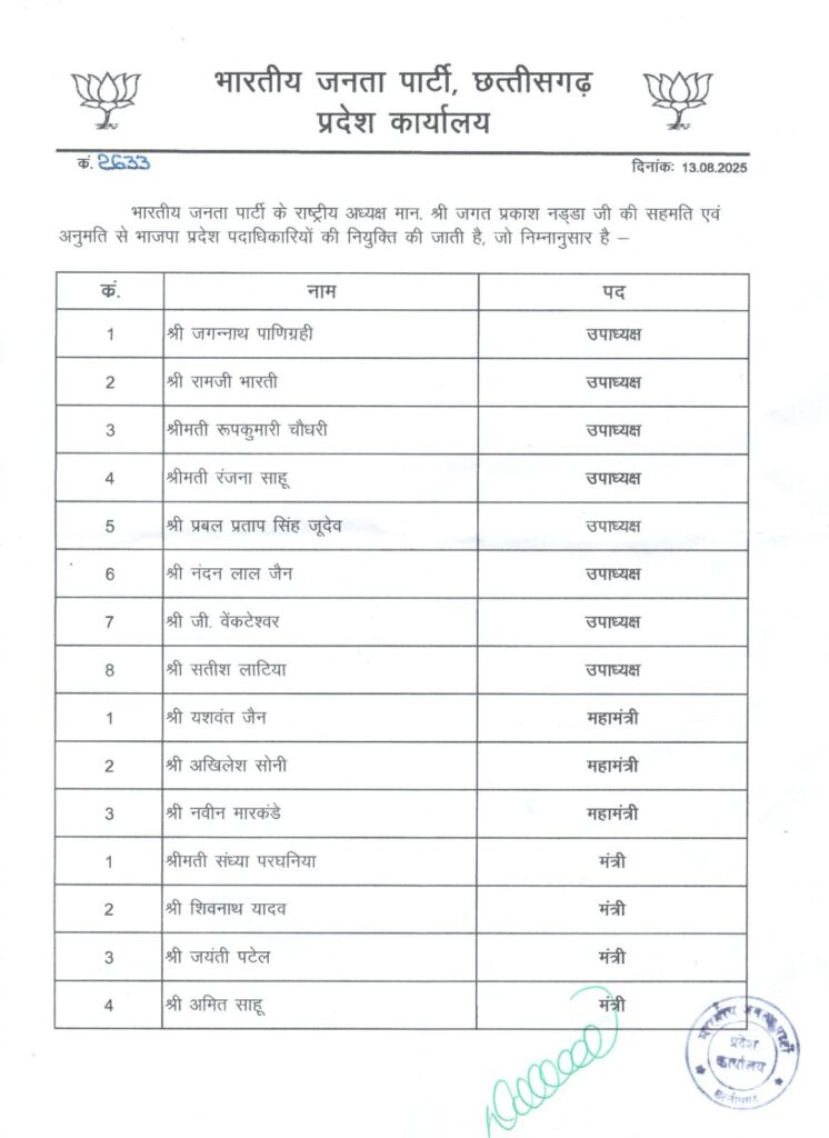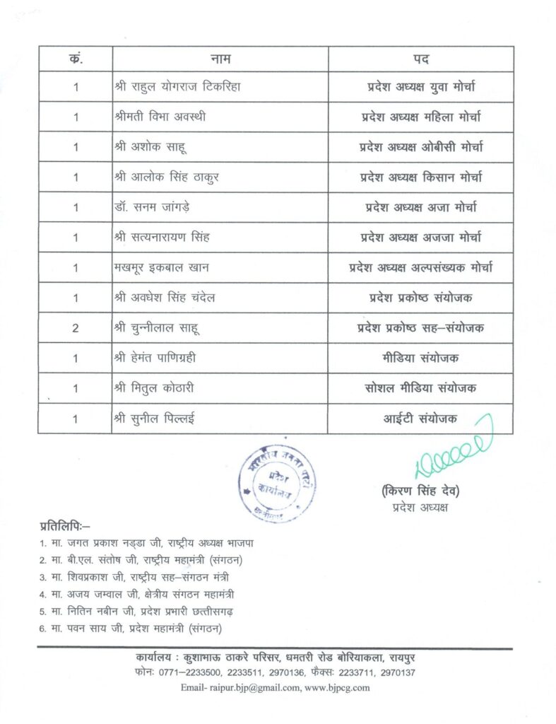 रायपुर। भारतीय जनता पार्टी के प्रदेश अध्यक्ष किरण सिंहदेव ने अपनी नई टीम का ऐलान कर दिया है। इस टीम में कई नए चेहरों को जगह मिली है, जबकि कुछ वरिष्ठ नेताओं को नई जिम्मेदारियां सौंपी गई हैं।