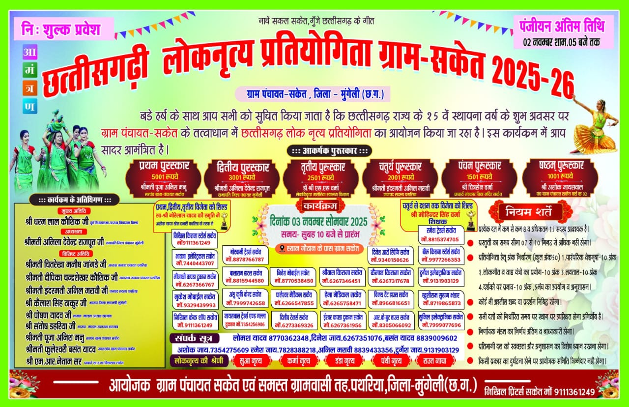 छत्तीसगढ़ राज्य के 25वें स्थापना दिवस और एकादशी के पावन अवसर पर ग्राम पंचायत सकेत में 3 नवम्बर (सोमवार) को छत्तीसगढ़ी लोकनृत्य प्रतियोगिता का भव्य आयोजन किया जा रहा है। यह कार्यक्रम ग्राम पंचायत सकेत एवं समस्त ग्रामवासियों के सहयोग से आयोजित होगा। प्रतियोगिता सुबह 10 बजे से स्याम गौठान के पास प्रारंभ होगी।